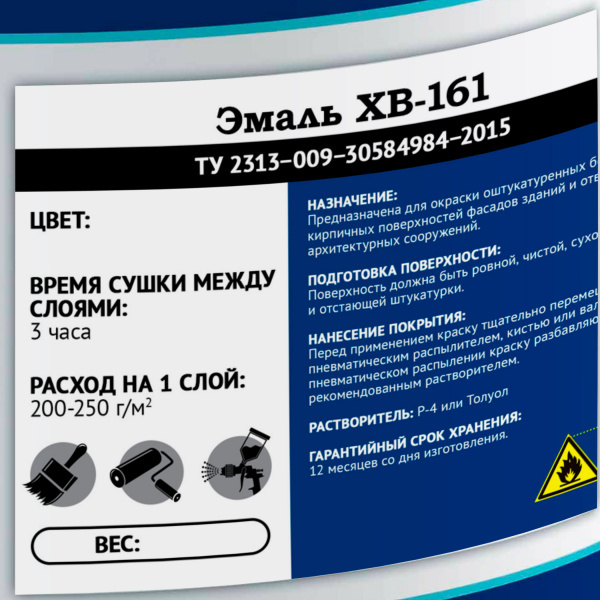 Краска ХВ-161 (эмаль ХВ-161) предназначена для окраски бетонных, кирпичных, оштукатуренных поверхностей фасадов зданий, ответственных архитектурных сооружений и других конструкций эксплуатирующихся в атмосферных условиях