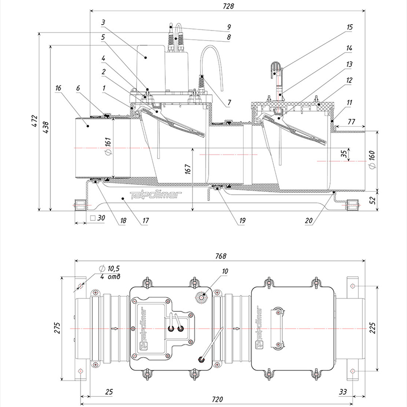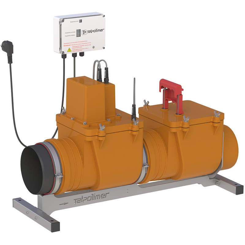 Клапан обратный с электроприводом ТП-85.160-КЗЭ - канализационный затвор с электроприводом предназначен для фекальных стоков систем внутренней канализации и используется для предотвращения обратного хода стоков при подтоплении или засоре канализационных магистралей. Канализационный затвор устанавливается в цокольных и подвальных помещениях перед выходом из здания стоков вышерасположенных помещений и служит для автоматического перекрытия канализационной магистрали. Затвор с электроприводом работает от стандартной электросети напряжением 220В, а также имеет резервное питание от аккумулятора продолжительностью до 96 часов. Затвор ТП-85.160-КЗЭ состоит из блока управления и 2-х камер - камеры с электроприводом заслонки и камеры с ручным управлением (закрытием) заслонки. Камеры расположены на стальной раме и закреплены хомутами. Блок управления вынесен на проводе. Канализационный затвор может пропускать фекальные стоки температурой от -1°C до +60°C и кратковременно (2-4 часа) не свыше +80°C.