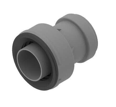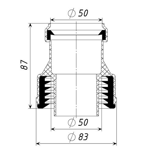 Переходник ТП-9/50 состоит из корпуса, в верхней части которого находится раструб с уплотнительным кольцом для соединения с полимерной трубой или выпуском трапа, кровельной воронки, а в нижней – эластичная многоязычковая манжета для соединения со стальной или чугунной безраструбной трубой.