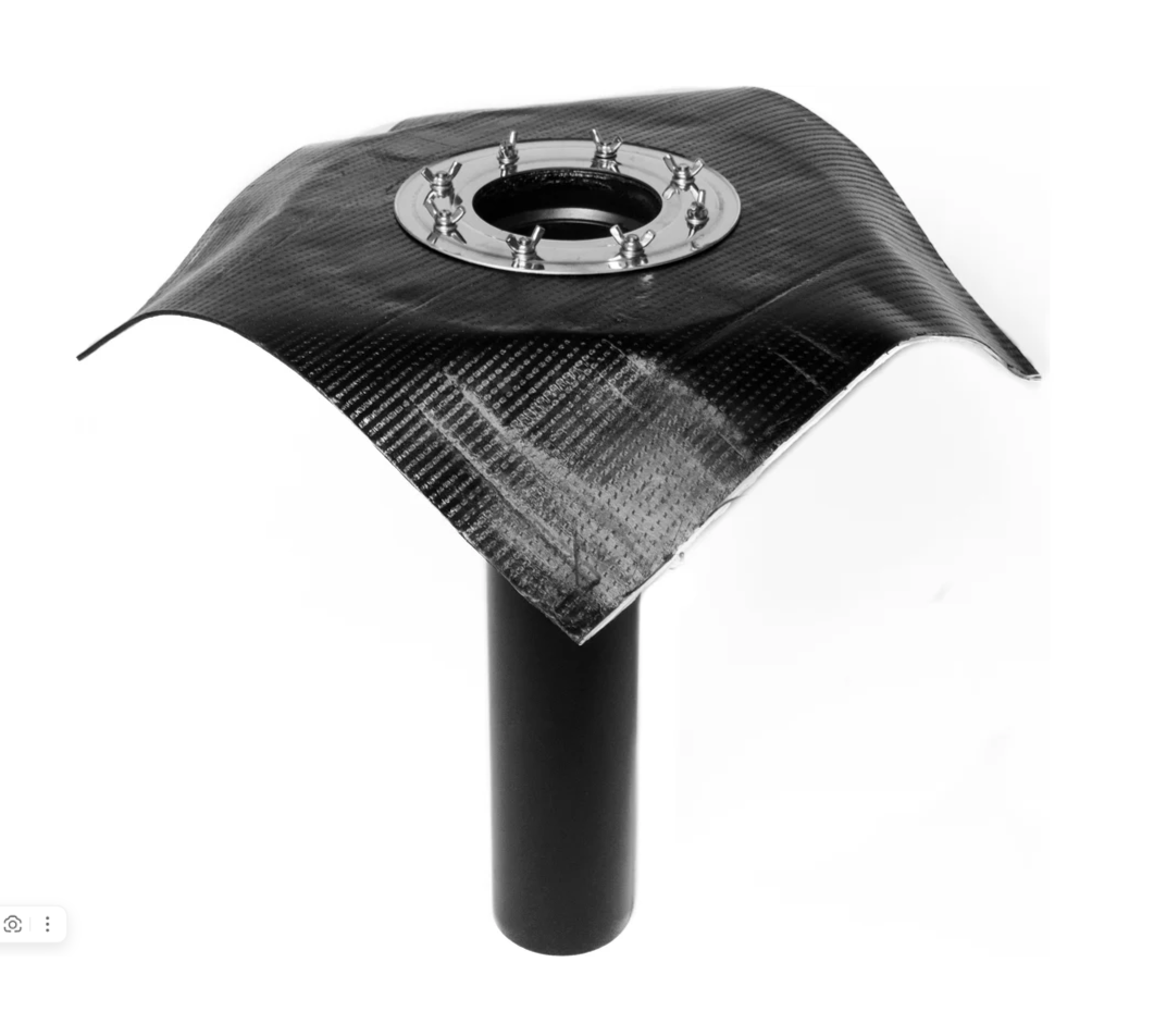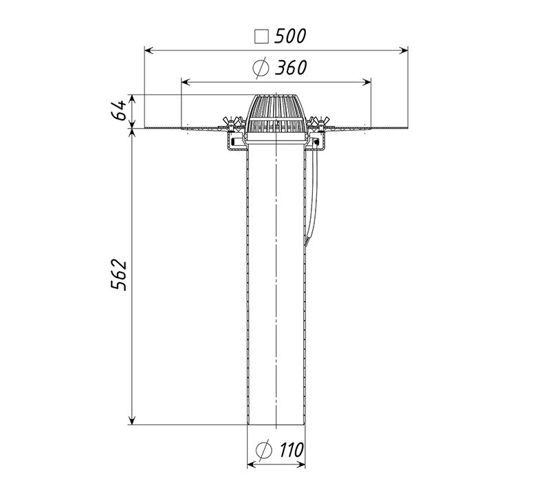 Кровельная воронка с гидроизоляционным полотном производится с увеличенным корпусом для большего прилегания гидро- и пароизоляции к воронке, а её основания – к плоскости кровли. В основании воронки имеются технологические отверстия для дополнительной фиксации к основанию кровли – ж/б перекрытиям, профнастилу из стального листа и т.п.