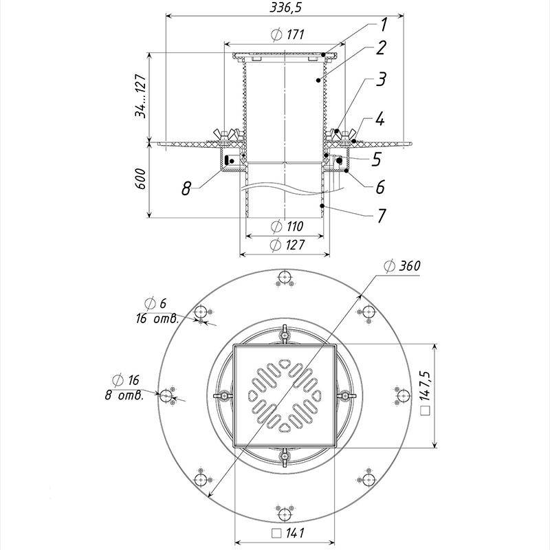 Кровельная воронка с вертикальным выпуском ТП-03.100/6-Э Воронка с трапом для эксплуатируемой кровли