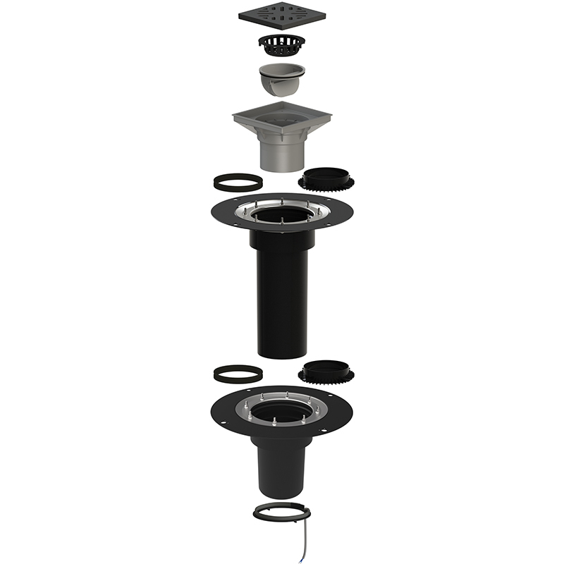 Двухуровневая кровельная воронка ТП-10.616-Э с трапом, с прижимными фланцами из нержавеющей стали, с запахозапирающим устройством, с мусоросборником и с дренажным кольцом (ТП-74.100) предназначена для отвода дождевой и талой воды с верхних и нижних слоев многоуровневых кровель в дождевую канализацию. Применяется на неэксплуатируемых и эксплуатируемых инверсионных кровлях с любыми гидро-, пароизоляционными материалами и теплоизоляцией, с «пирогами» любой толщины и наполнения. Используются для непосредственного монтажа со стальными, чугунными или пластиковыми трубами.