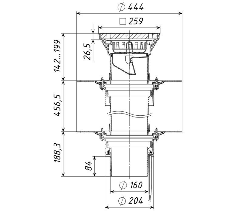 Двухуровневая кровельная воронка ТП-10.616 с трапом, с прижимными фланцами из нержавеющей стали, с запахозапирающим устройством, с мусоросборником и с дренажным кольцом (ТП-74.160) предназначена для отвода дождевой и талой воды с верхних и нижних слоев многоуровневых кровель в дождевую канализацию. Применяется на неэксплуатируемых и эксплуатируемых инверсионных кровлях с любыми гидро-, пароизоляционными материалами и теплоизоляцией, с «пирогами» любой толщины и наполнения. Используются для непосредственного монтажа со стальными, чугунными или пластиковыми трубами.