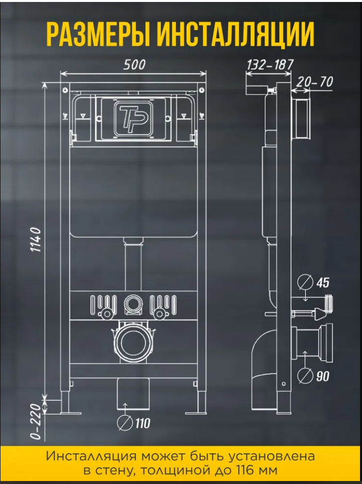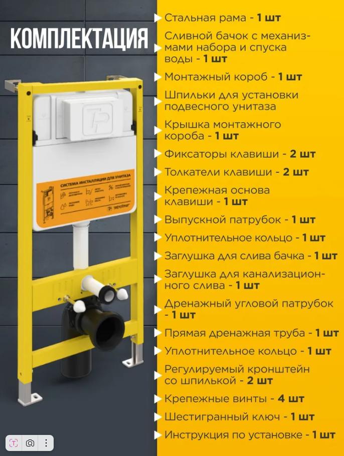 - Инсталляция для подвесного унитаза Татполимер – это скрытая система монтажа, обеспечивающая надежность и долговечность. Стальная рама с антикоррозийным покрытием выдерживает нагрузку до 400 кг, что гарантирует безопасность эксплуатации.