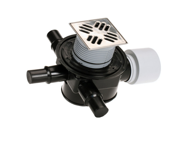 Трап для внутренних помещений с механической задвижкой для предотвращения затопления помещения при возникновении подпора в наружной сети, с решеткой 115*115 мм в подрамнике 123*123 мм, высотой гидрозатвора 50мм, с горизонтальными нормально заглушенными тремя входами и горизонтальным выпуском